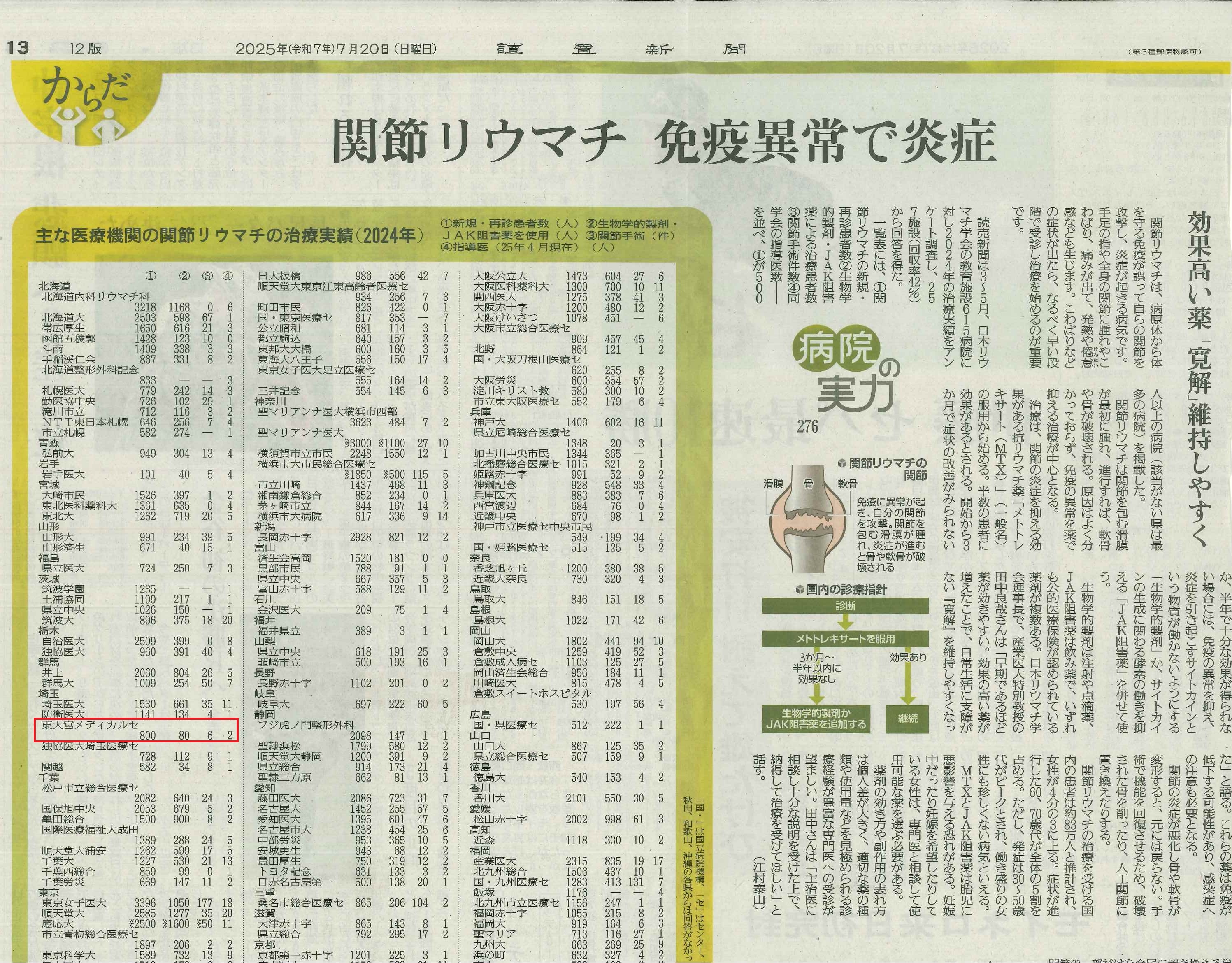 当院は、2025年7月20日に発行された読売新聞「病院の実力」の【関節リウマチ】の記事に掲載されました。