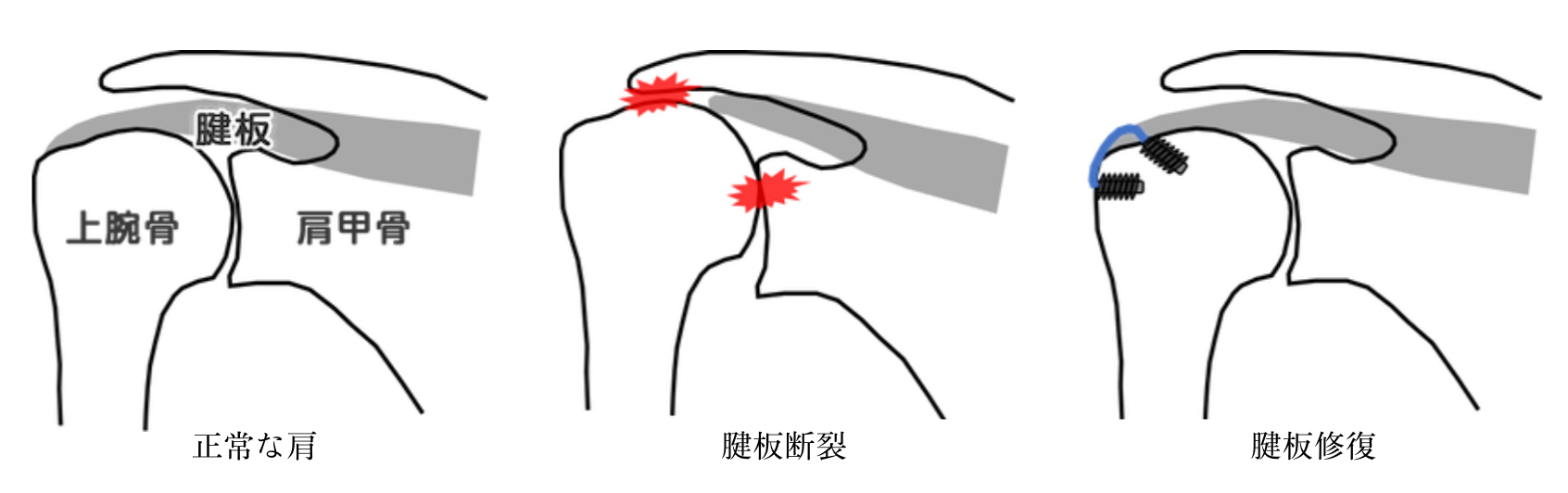 診断には肩の動きや筋力の確認、単純X線検査やMRI検査で腱板の状態を確認します。