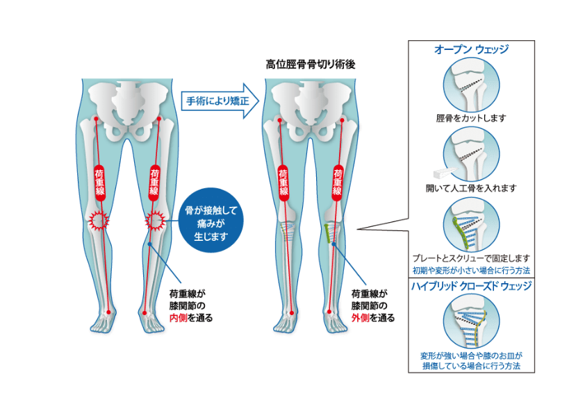 こうした保存療法を行っても疼痛が改善せず、日常生活に支障を来す場合は、手術を検討します。手術療法は、患者さんの年齢や生活背景、膝関節の変形の程度を考慮し、最善の方法を選択します。