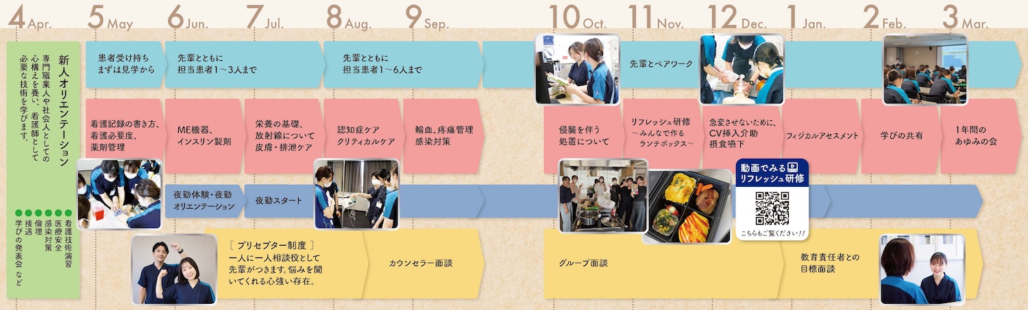 新人教育では、新人看護師が1年間かけて成長できるよう研修プログラムを組んでいます。