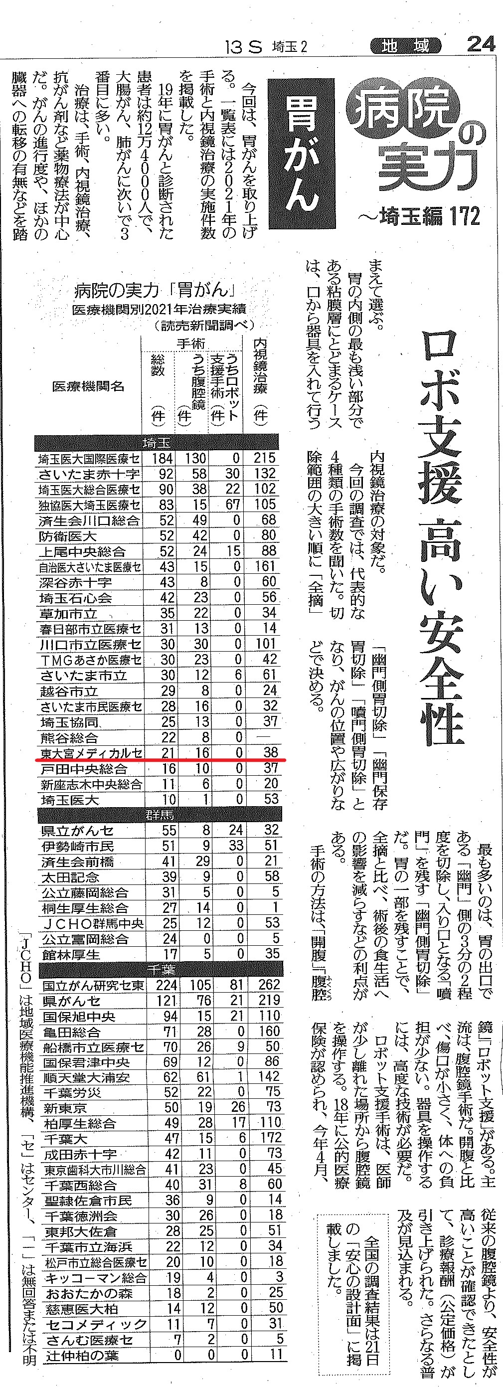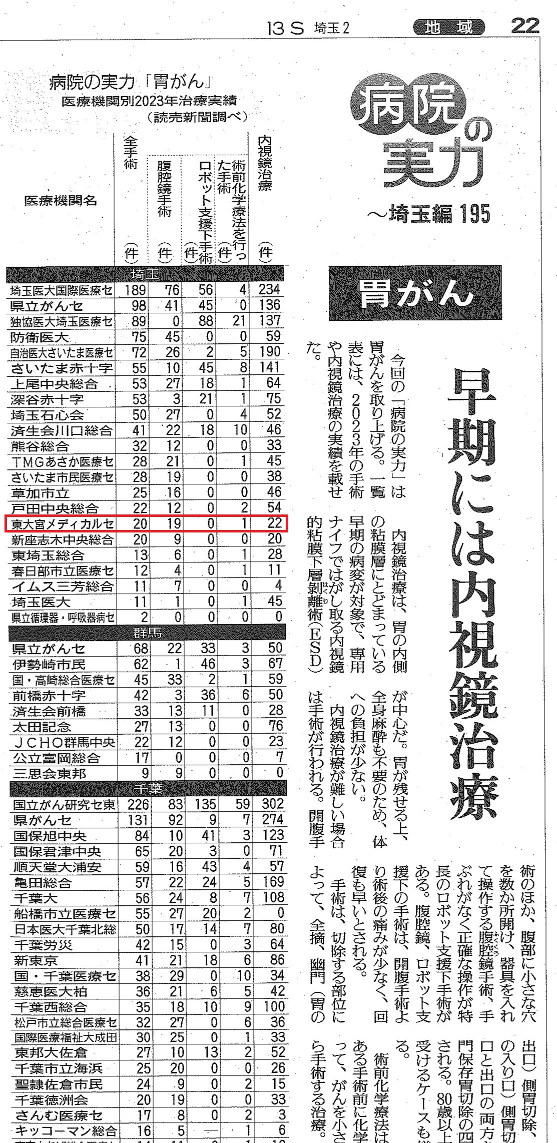 当院が読売新聞「病院の実力」の【胃癌の治療実績】の記事に掲載されました。