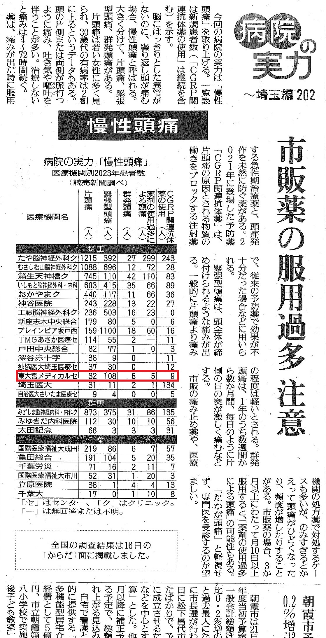 当院は、2025年3月23日に発行された読売新聞「病院の実力」の【慢性頭痛】の記事に掲載されました。