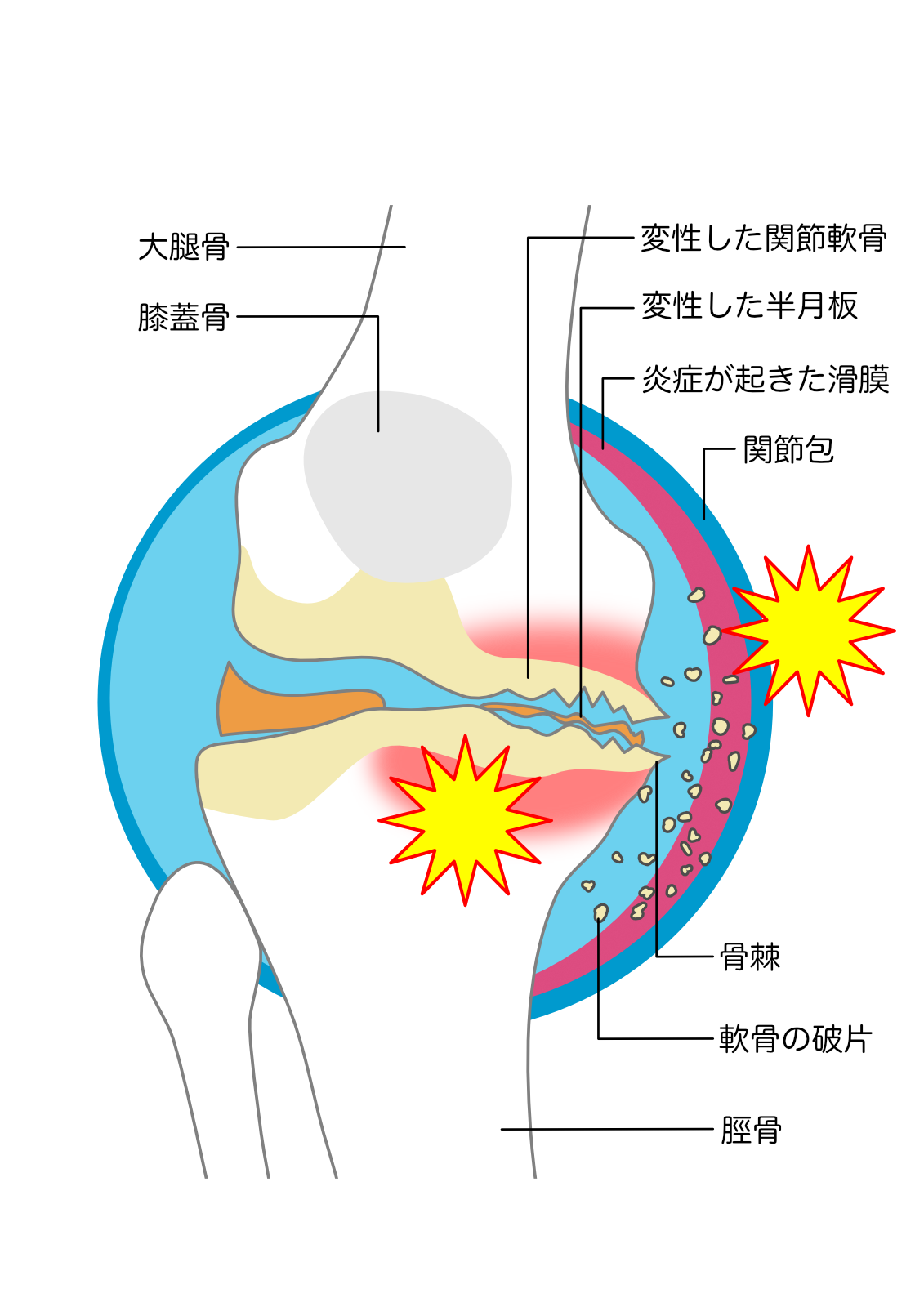 変形性膝関節症とは、加齢の影響や外傷に伴う二次性の変化で膝の軟骨がすり減り、膝に痛みが生じるようになる病態です。